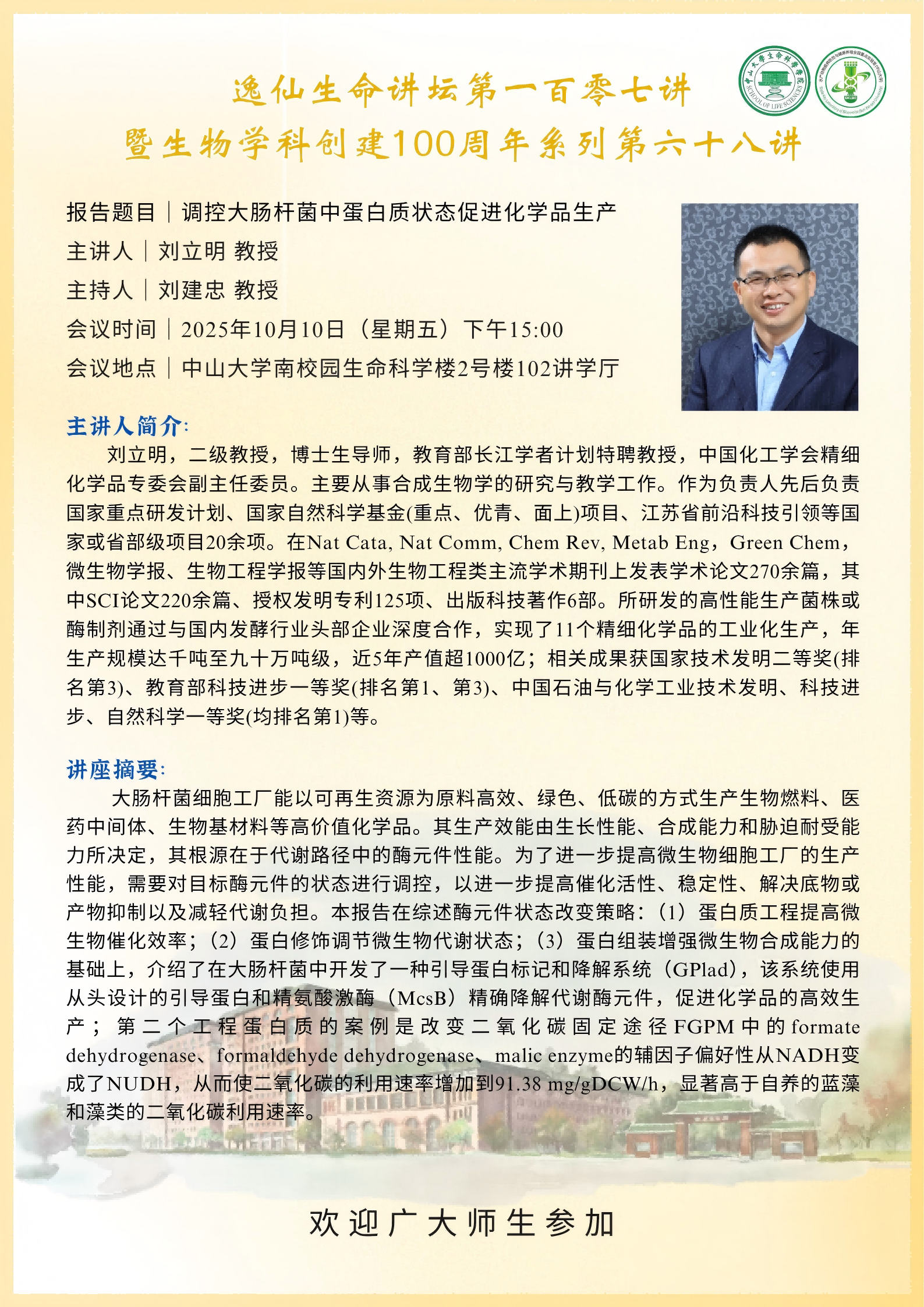 生科动态 • HEADLINES 2025/03/07 2025年度海外优青丨中山大学生命科学学院诚邀全球青年学者依托申报 2025/08/18 中山大学 | 二次遴选专业整合科学专业介绍会 2025/07/17 关于中山大学生命科学学院2025年生命科学前沿国际暑期学校录取名单的通知 2025/07/10 中山大学生命科学学院2025年生命科学前沿国际暑期学校【第二轮通知】 2025/06/20 中山大学生命科学学院2025年生命科学前沿国际暑期学校 【第一轮通知】 查看更多> 通知公告 • NOTICES 学院通知 党建通知 科学研究 本科生教育 研究生教育 学生工作 人事通知 信息与下载 党建工作 人才培养 科研动态 综合新闻 我院生生不息系列活动“弘扬科学精神,勇攀RNA科学高峰”讲座成功举办 2025-06-05 生命科学学院关于做好2025届毕业生党员组织关系转出和入党材料移交等工作的通知 2025-06-05 关于确定邓子悦同学为发展对象的公示 2025-04-26 查看更多> 中山大学生命科学学院2026年接收优秀应届本科毕业生推荐免试攻读研究生报名通知 2025-09-22 中山大学生命科学学院2026年接收优秀应届本科毕业生推荐免试攻读研究生预报名拟录取名单(第一批)公示 2025-09-21 中山大学生命科学学院 2026年优秀应届本科毕业生免试攻读研究生(含直博生)预报名复试的通知(第一批) 2025-09-15 查看更多> 生物学科创建100周年系列第六十八讲:调控大肠杆菌中蛋白质状态促进化学品生产 2025-10-09 生物学科创建100周年系列第六十六讲:光遗传学:植物科学的新纪元 2025-09-17 生物学科创建100周年系列第六十五讲:细胞谱系研究与干细胞多能性 2025-06-25 查看更多> 2025年度海外优青丨中山大学生命科学学院诚邀全球青年学者依托申报 2025-03-07 转发人力资源管理处关于开展2025年度第二批次中山大学逸仙博士后计划申报工作的通知 2025-09-30 转发人力资源管理处关于开展2025年度中国博士后科学基金第78批面上资助申报工作的通知 2025-06-30 查看更多>