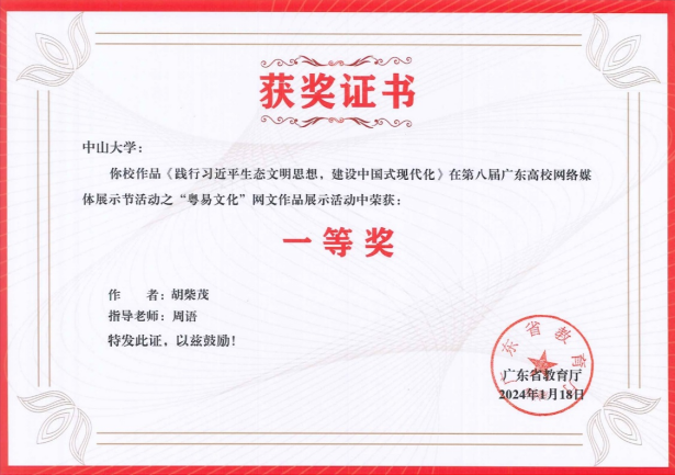 近日,广东省教育厅公布了第八届广东高校网络媒体展示节活动结果,我院2021级生物技术专业本科生胡柴茂作品荣获一等奖。
