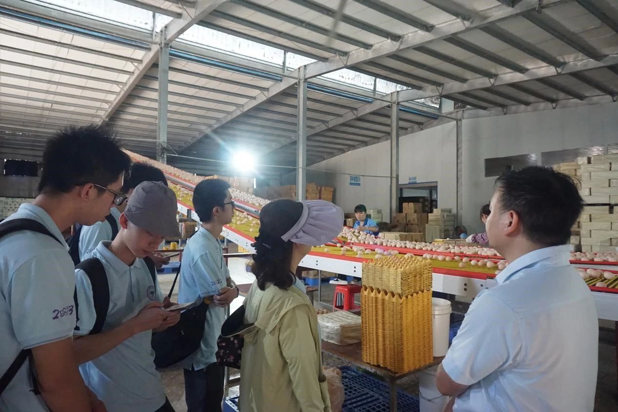 调研组成员在公司负责人的带领下现场考察了鸡舍喂养、产蛋等养殖流程,学习了减少蛋鸡染病的“良苦用心”:将养殖场建在山丘之上,利用从上至下的山风减少地面的细菌病毒向上传播的可能性;鸡舍内外有三到四层防护措施,保证尽可能少的病毒、细菌进入鸡舍;采购国外先进设备,并依照当地蛋鸡品种及环境对鸡舍设备进行改造,使得鸡舍内空气能够更好的流通,温度更加稳定,从而提升鸡舍中鸡的免疫力。