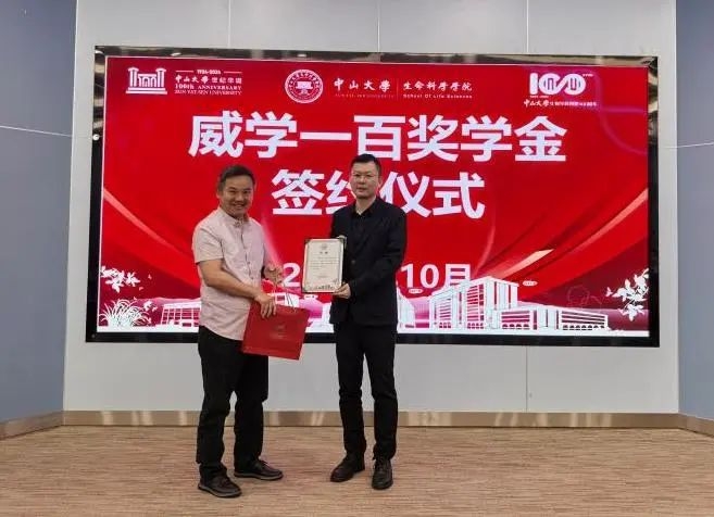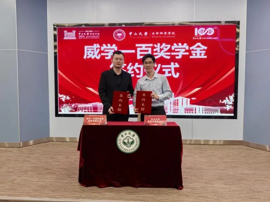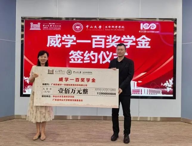 广州市威学一百国际教育科技有限公司向中山大学生命科学学院捐赠100万元人民币设立威学一百奖学金,用于支持自然科学领域高素质人才培养工作。奖学金分10年发放,用于奖励中山大学生命科学学院和外国语学院优秀本科生,鼓励学生不断进取,勇攀高峰。此项捐赠充分体现了广州市威学一百国际教育科技有限公司高度的社会责任感和对高等教育事业的大力支持。