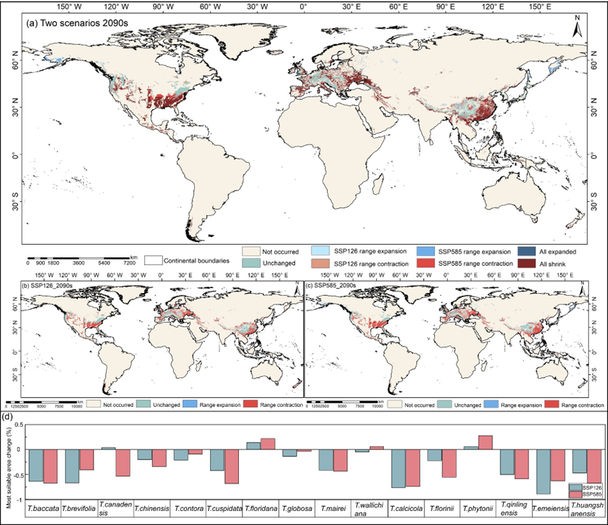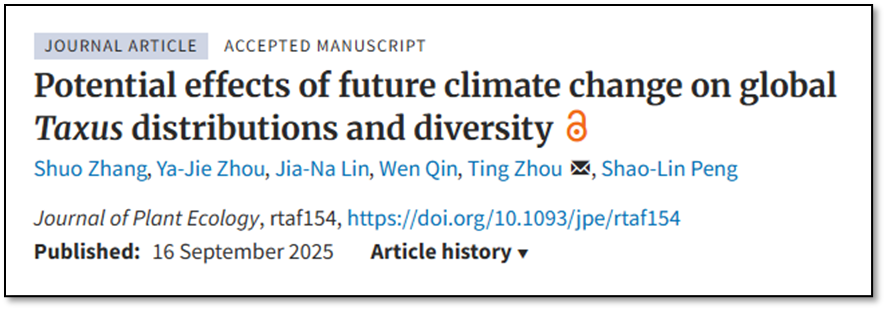 该成果以“Potential effects of future climate change on global Taxus distributions and diversity”为题发表在生态学经典期刊Journal of Plant Ecology上。我院博士研究生张朔为论文第一作者,硕士研究生周娅洁为论文第二作者,我院研究生林佳娜和秦雯也参与了该项工作。周婷副教授为通讯作者,彭少麟教授对文章做出了重要贡献。该研究得到了国家自然科学基金重大项目、科技部基础工作专项和广东省基础与应用基础研究基金等多个项目的资助。