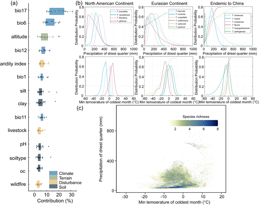 红豆杉是最具有代表性的濒危物种之一,也是自然界中唯一能天然合成抗癌药物紫杉醇的珍稀植物,因其独特的药用价值和极高的经济价值,对人类的健康福祉有着不可替代的作用而受到广泛关注。然而,红豆杉的全球分布格局和气候响应机制仍不清楚。此外,关键驱动因子的定量缺失严重制约了保护策略的精准制定。在此,我们首次在全球尺度上提供了红豆杉的综合气候影响评估。通过堆叠物种分布模型预测了物种丰富度的分布格局和驱动机制(图1)。