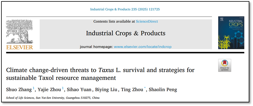 该成果以“Climate change-driven threats to Taxus L. survival and strategies for sustainable Taxol resource management”为题发表在农林科学经典期刊Industrial Crops and Products上。我院博士研究生张朔和硕士研究生周娅洁为论文共同第一作者,我院研究生源思浩和刘碧颖也参与了该项工作。周婷副教授为通讯作者,彭少麟教授对文章做出了重要贡献。该研究得到了国家自然科学基金重大项目、科技部基础工作专项和广东省基础与应用基础研究基金等多个项目的资助。