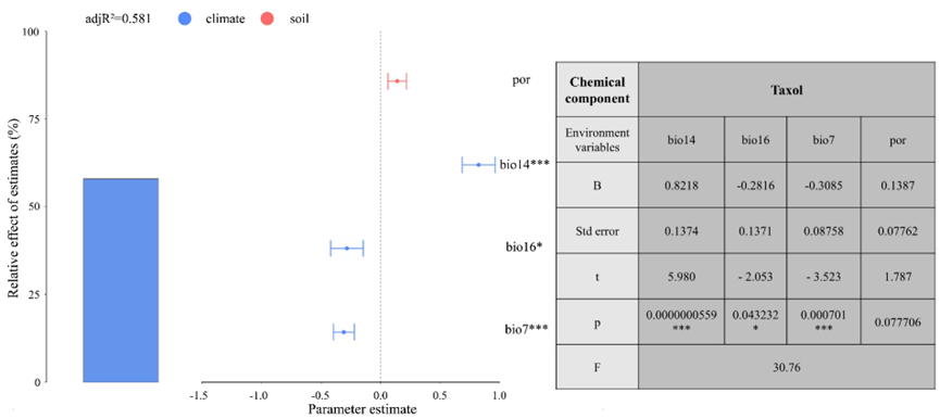 图4 紫杉醇与环境变量之间的相关性。注:***、**、*分别代表0.1%、1%和5%的显著性水平。