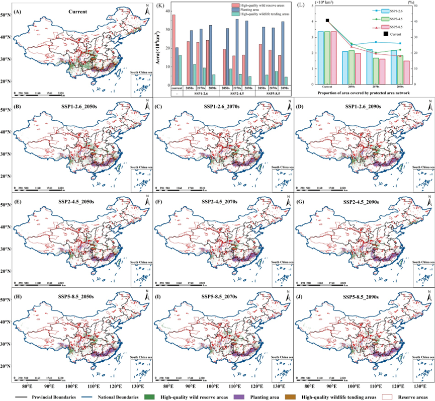 图5 红豆杉属WTA和WRA规划 ((A)-(G): WTA和WRA分布图; (H): WTA和WRA面积趋势; (I): 保护区对WTA和WRA的有效保护率)。