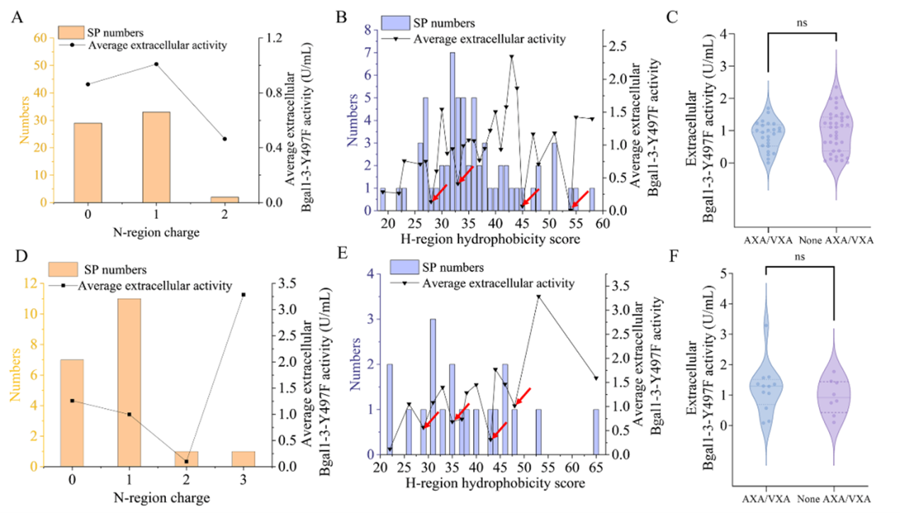 图2 毕赤酵母信号肽序列特征与分泌效率之间的关系。A:内源信号肽N区。B:内源信号肽H区。C:内源信号肽C区。D:外源信号肽N区。E:外源信号肽H区。F:外源信号肽C区。