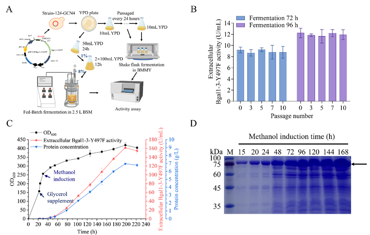 图3 工程菌株高密度发酵。A:实验流程。B:遗传稳定性测试。C:高密度发酵和产酶情况。D:发酵上清中的目的蛋白检测。