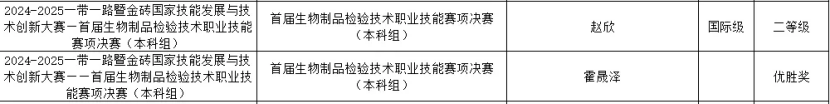 5我院学生参加2024-2025一带一路暨金砖国家技能发展与技术创新大赛首届生物制品检验技术职业技能赛项决赛(本科组)共获得优胜奖1项、国际级二等奖1