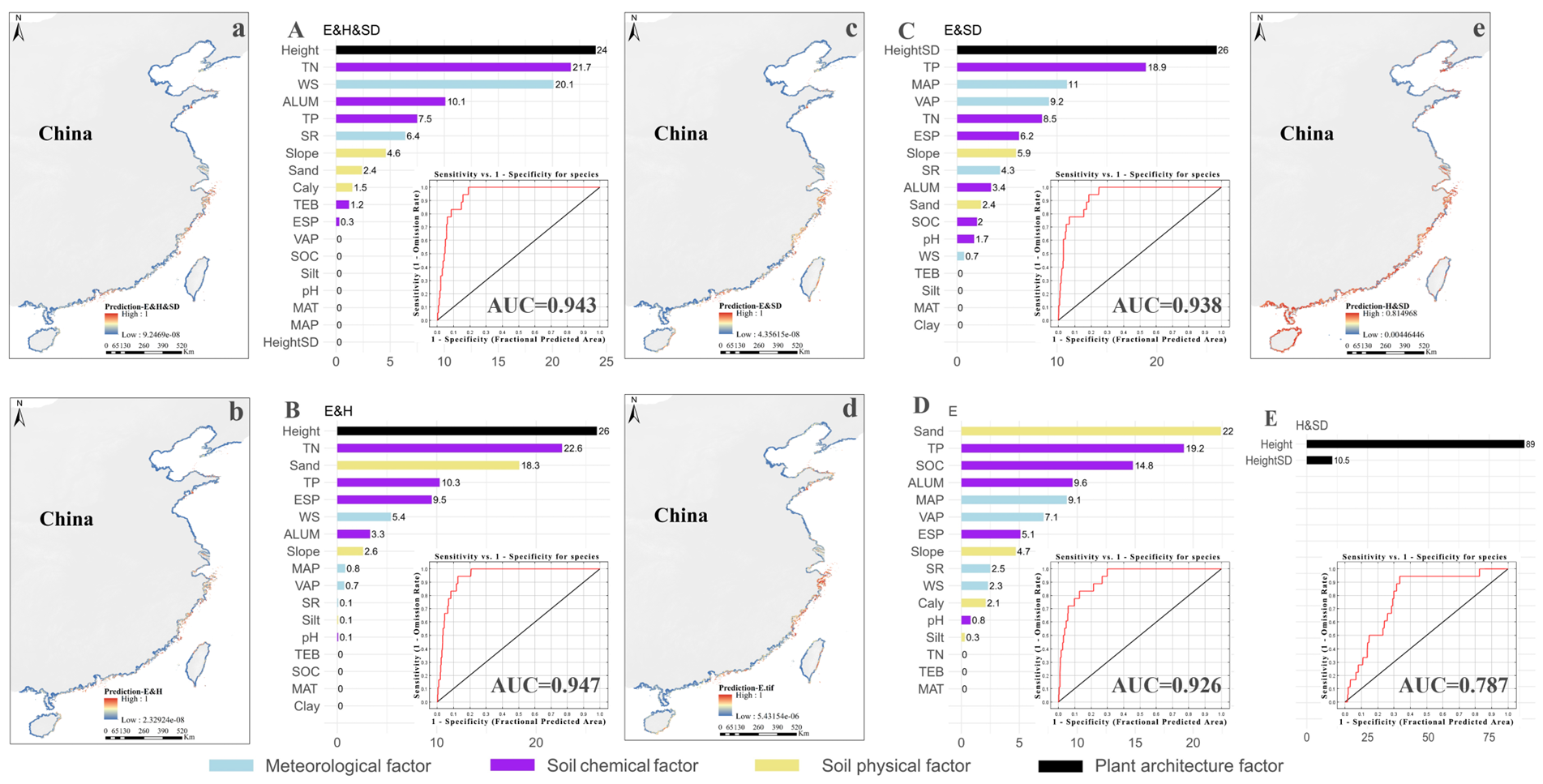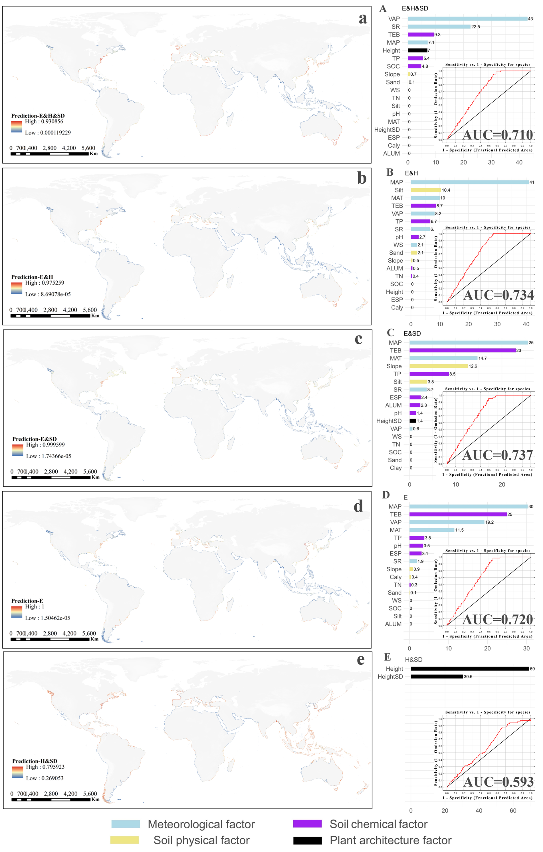 研究结果显示,植物株高(Height)是表征滨海矮林最核心的性状指标。在区域尺度上(如中国全境),引入真实的性状数据显著提升了植被模拟的准确性(AUC高达0.947,图1)。然而,在跨尺度的全球模拟中,即使筛选出了最相关的性状,但其并不能优化植被模拟的准确性(图2),性状均值的作用受到物种组成和环境异质性的挑战。