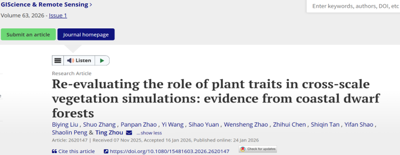 上述研究成果以“Re-evaluating the role of plant traits in cross-scale vegetation simulations: Evidence from coastal dwarf forests”为题,发表于GIScience & Remote Sensing(中科院一区,TOP期刊)。我院刘碧颖博士(现为中山大学生态学院博士后)为论文第一作者,周婷教授为通讯作者,赵盼盼和王毅博士,博士研究生张朔和陈志晖,硕士研究生源思浩、赵文胜,谭诗琴和本科生邵屹璠参与了此项工作,彭少麟教授组织了该项工作。该研究得到了国家自然科学基金(42293354)、南岭国家公园生物多样性综合科学调查(2025267)、国家公园建设专项基金(2021GJGY034)、中国教育部基础与交叉学科突破计划(JYB2025XDXM902)以及国家科技基础资源调查专项基金(2019FY202300)的资助。