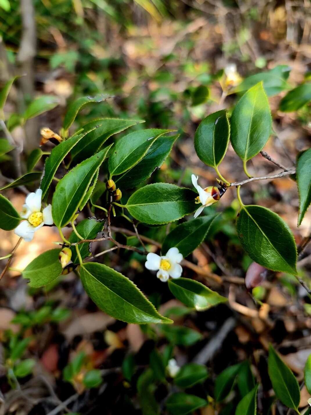 就在这片光影交错的林下,一株形态独特的灌木闯入了研究人员的视野。它枝条纤细疏朗,树皮泛着与周围丹霞赤壁相映成趣的棕红色光泽,在粗犷的岩石背景下,透出一种别样的清雅与坚韧。初看之下,它似乎与湖南的攸县油茶有几分相似,但其更为早醒的花期和独特的树姿,立刻引起了敏锐的科研人员的警觉。