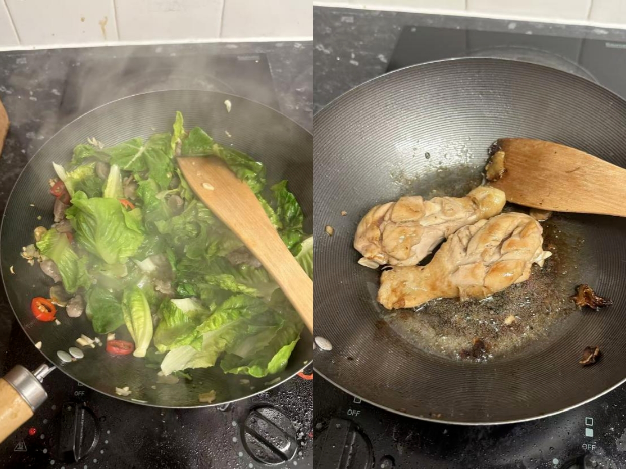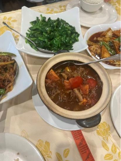 当然,也偶有外出点菜改善伙食的日子。作为中国人,虽也能欣赏牛扒汉堡的滋味,但终究还是不免更青睐中餐。第一次前往中餐馆品尝到番茄牛肉、水煮青菜这类家常菜肴时(图9),竟恍惚之间有重返穗城的感觉,莼鲈之思油然而起。