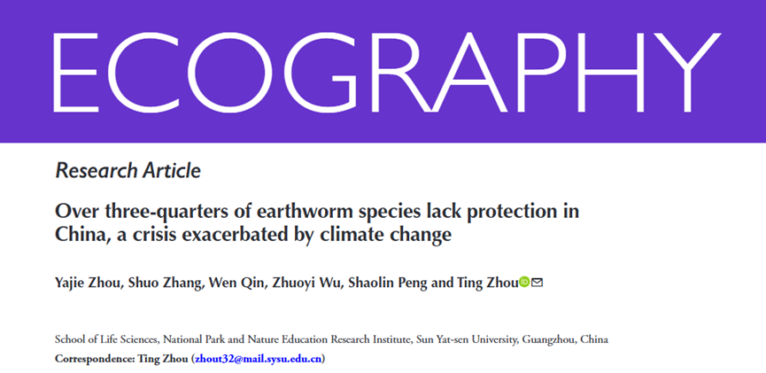该成果以“Over three-quarters of earthworm species lack protection in China, a crisis exacerbated by climate change”为题发表在生态学经典期刊Ecography上。我院硕士研究生周娅洁和博士研究生张朔为论文共同第一作者,我院研究生秦雯和吴卓忆也参与了该项工作。周婷教授为通讯作者,彭少麟教授对文章做出了重要贡献。该研究得到了南岭国家公园生物多样性综合科学调查(2025267)、国家公园建设专项基金(2021GJGY034)和国家自然科学基金重大项目(42293354)等多个项目的资助。