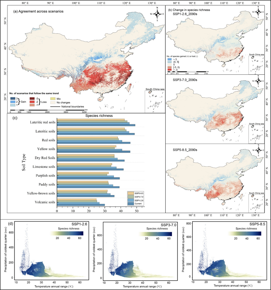 图 1. 2090s时期不同气候变化情景下蚯蚓物种丰富度变化及其影响机制。