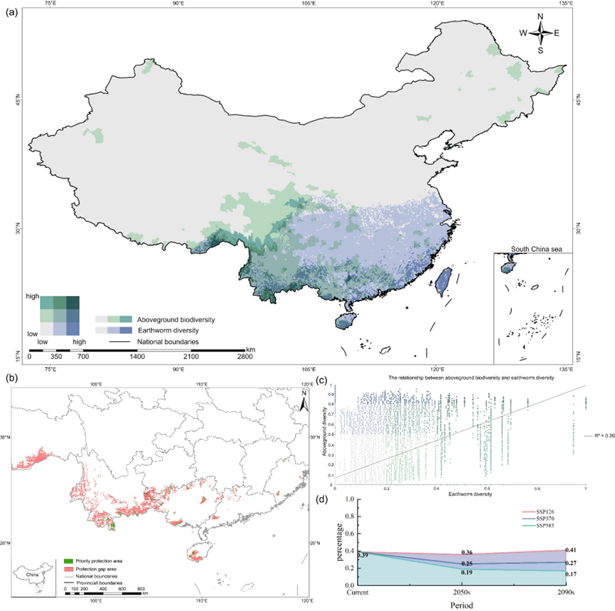 (a)蚯蚓多样性与地上生物多样性的空间一致性格局(绿色和蓝色分别表示高地上生物多样性与高蚯蚓多样性。深绿色表示二者均处于高多样性水平,而灰色则代表二者多样性均较低)。(b)高地上生物多样性与高蚯蚓多样性的相关关系。(c)不同气候变化情景下高地上生物多样性与高蚯蚓多样性的空间一致性程度。(d)蚯蚓多样性与地上生物多样性的优先保护区与保护空缺的划定(将保护区内二者高多样性重叠区划定为优先保护区域,其余部分视为保护空缺)。