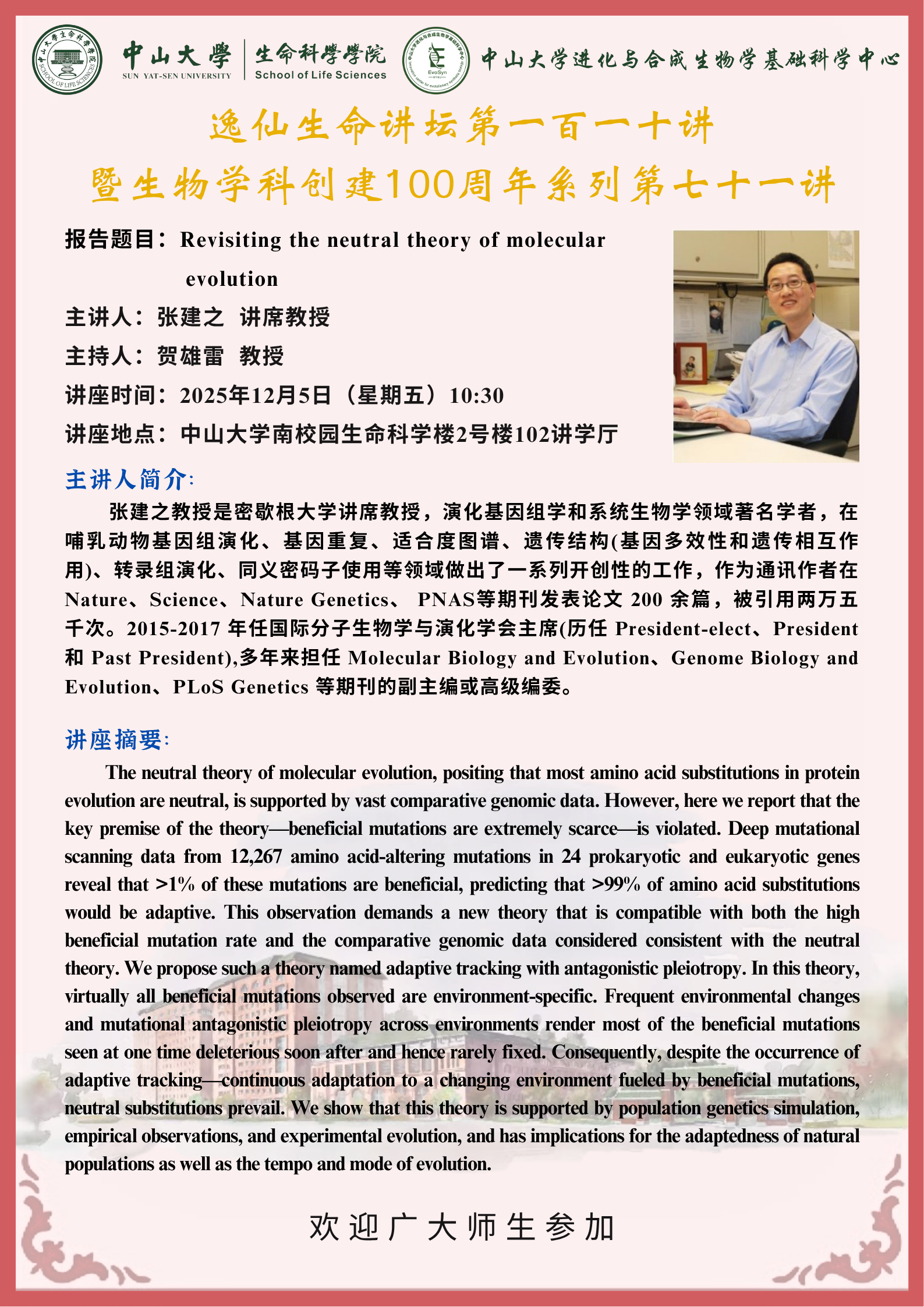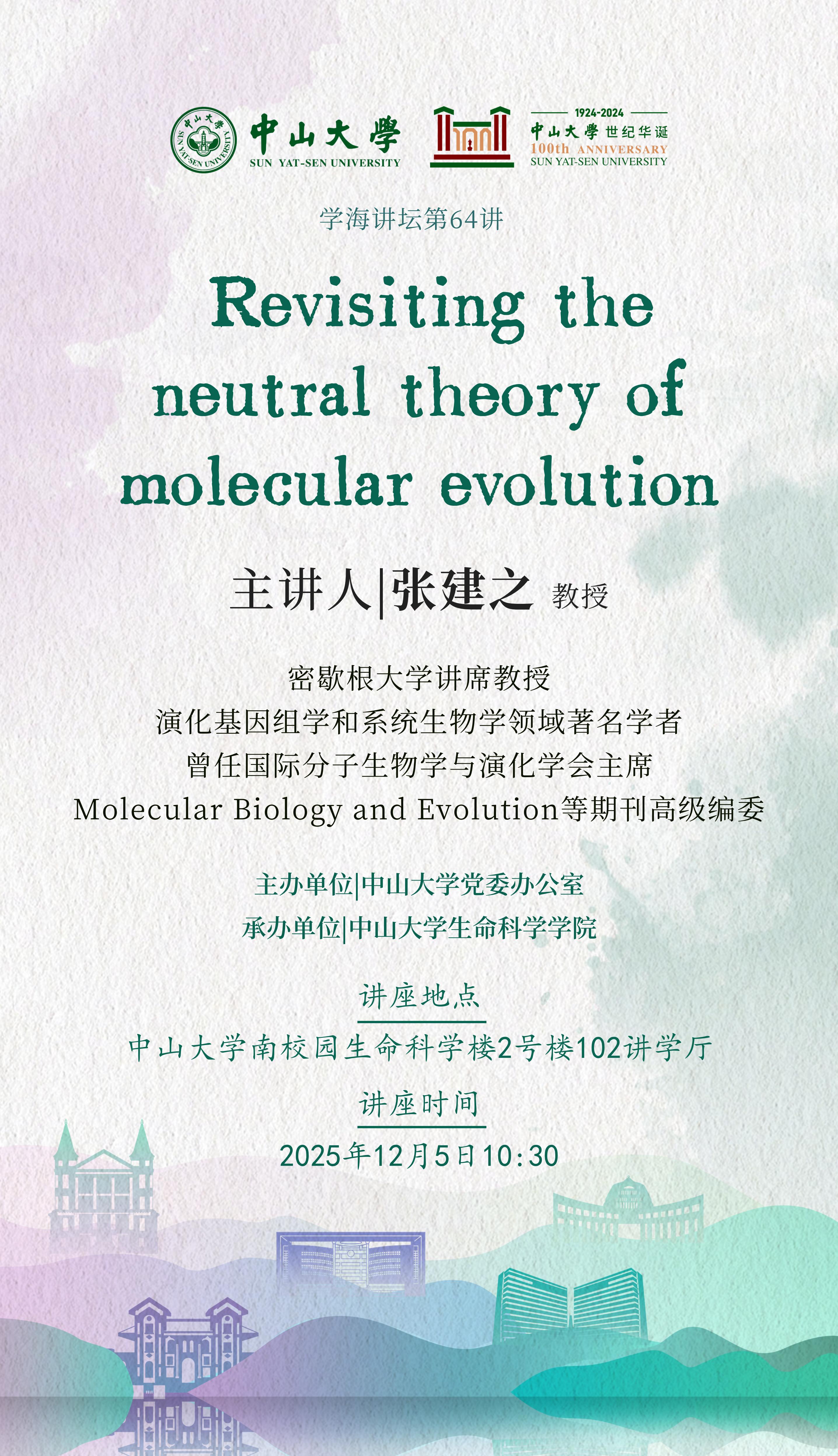 2025年12月5日中山大学学海讲坛第64讲暨生命科学学院逸仙生命讲坛第110讲:Revisiting the neutral theory of molecular evolution