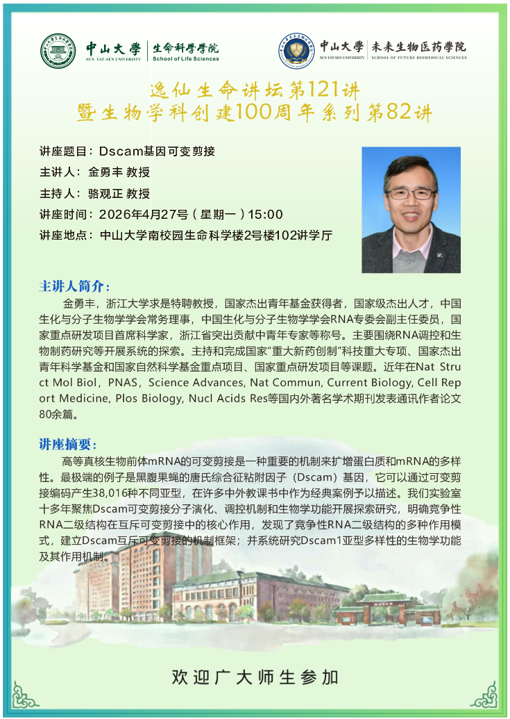 导航痕迹 中山大学生命科学学院 2026年4月27日逸仙生命讲坛121讲:Dscam基因可变剪接 扫描此二维码分享 2026年4月27日逸仙生命讲坛121讲:Dscam基因可变剪接 发布人:李晶 发布日期:2026-04-22 活动时间 2026年04月27日 15:00 - 2026年04月27日 17:00