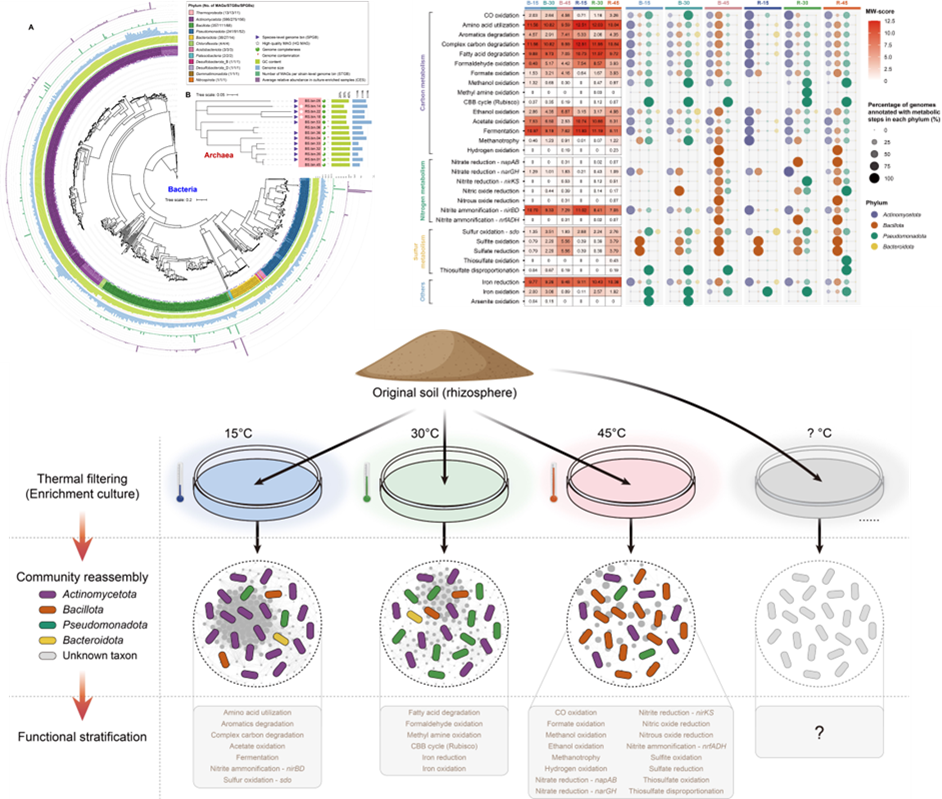 2.3 通过富集培养宏基因组学 (CE-MGS) 系统揭示了沙漠可培养细菌群落在不同温度下的重组模式,反映了其分类组成、共现网络结构及功能分层的温度依赖性,通过该策略获得了大量高质量可培养细菌基因组 (cMAGs, >1000) ,并识别出丰富的潜在新物种(>200),为理解沙漠微生物的热适应机制及其在全球变暖背景下的生态功能提供关键基因组资源。